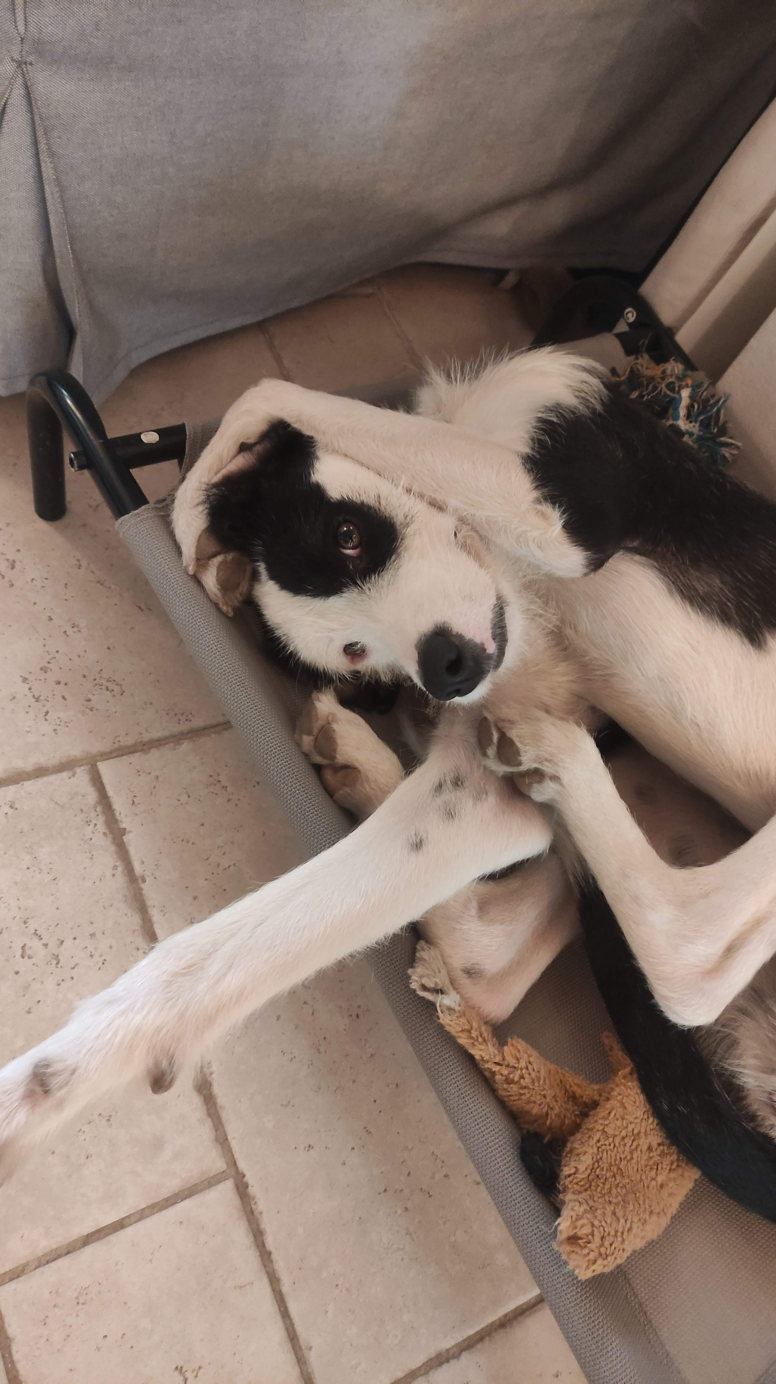 E’ arrivata fin qui da un canile siciliano, in cerca di una famiglia, ed aveva già un nome, Mirò. Il cognome gliel’ho dato io, fa “Iononlavolevo”, ma non lo usiamo mai.